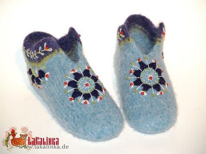 The seamless felted women´s slippers are knitted in one. They are decorated with embroidery and beads. The pattern is in English. (GERM/ Die deutsche Übersetzung auf die Anfrage.)
