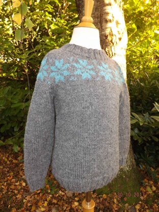 This is the boy’s version. The sweater/pullover is worked from the bottom edge and up with a 2-color star stripe on the yoke. The sweater has a combined round and raglan yoke and sleeve construction. The Sweater has traditional rib edges. The pattern is made for at yarn with a gauge of 18 stitches per 10 centimeters (stockinette stitch / 2-colored stockinette stitch) i.e. a yardage of approximate 90 meters per 50 grams.