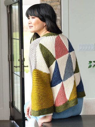 Make a statement in the comfiest of ways with this quilt-inspired coatigan! Worked in pieces and seamed, it’s fun to lay out the squares to find the perfect