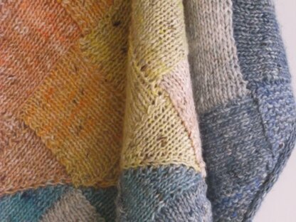 This entrelac wrap works the lighter panel first, then picks up stitches around two edges to work the contrasting color. Stitches are then picked up all around the outside, to work an i-cord edge.
