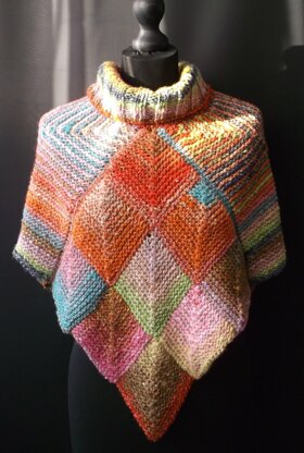 Four squares make this cosy Topper using Noro’s “Obi” yarn. It can be worn with the points at the front and back, or to the sides.