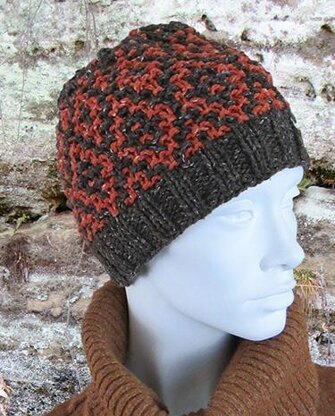 What to do with left over yarn? Make hats, of course! A variation on a theme, these two hats are worked in mosaic patterns similar to the Hedgerow Cardigan, using yarn left over from that cardigan, as well as the Desert Vista Throw. Worked in the round from the bottom up, begin with one color k2, p2 rib, then add in the contrasting color and work the mosaic pattern to the top, decreasing in pattern that’s similar to the rest of the hat.