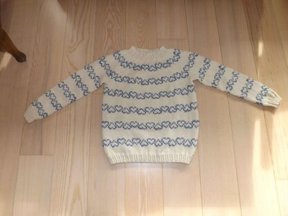 This is a very feminine lady's sweater with a round yoke. The pattern includes instructions for sweaters with chest width 87 (93, 93, 100, 113, 120, 127) centimeters. The sweater is knitted in the round from the bottom edge and up in two colours.