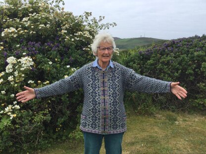 Many years ago my mum bought a commercially made jacket when in Norway on holiday. She asked if I could make her something similar but different using Scottish yarn, and this is the result. The body of the jacket is bordered by a traditional “snowflake” motif with a background of small crosses. The snowflake is repeated around the top of the dropped sleeves and a contrasting border at the cuffs, hem, collar and front bands also appears as a saddle on the shoulders. The edge to edge front bands are fastened with traditional Scandinavian style clasp fasteners. The garment is knitted in the round with steeks for the front and armholes, and the sleeves are picked up and knitted downwards. Optional afterthought pockets are added. The pattern is described in four sizes. My mum is wearing the second size with plenty of positive ease.