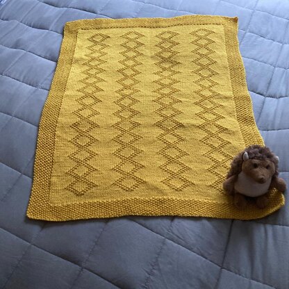 Worked in one piece with an integral moss stitch border, the central columns of diamonds add interest for the knitter, and tactile interest for the recipient!