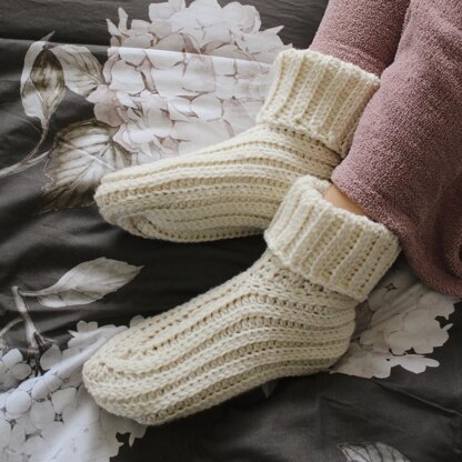 100% crochet, these slippers are definitely not knit! The ribbed soles and cuff create a gorgeous look, luxurious feel and cozy fit. These work up quickly (just a few short hours to complete a pair) and make a perfect gift!