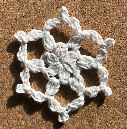 Every year, I make snowflakes to giveaway to friends, family and my co-workers. These little snowflakes make great little ornaments for a Christmas tree or to decorate a snowy window. This snowflake works up quick in 2 rounds.