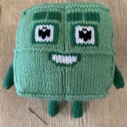 Four is knit slightly differently from the other numberblocks. His base is knitted flat, and then stitches are picked up along the selvedge and cast on edges, and the rest of his blocks are knit in the round. His eyes and mouth are duplicate stitched on before starting the decrease rounds and grafting the top seam shut. The arms/legs are knit separately and attached at the end. It requires about 80g of light green yarn for the body, 20g of dark green yarn for the arms and legs, and scrap amounts of black and white for the face. You'll also need stuffing, a tapestry needle, and stitch markers are always useful to keep track of stitches (although not essential). Skills required: casting on and joining in the round knitting purling kfb m1r m1l ssk k2tog three needle bind off duplicate stitch Kitchener stitch