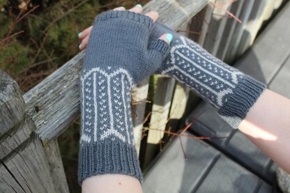 Numida Mitts were designed with an adorable feather motif inspired by the beautiful, helpful, and comical Guinea Fowl. They are knit from cuff to hand, using stranded colorwork to create the lovely feathers on the arms.