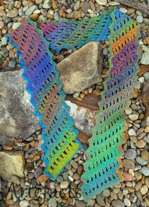 Because of the simplicity of the design, it works well with short-length self-striping yarn. However, there is nothing stopping you from trying a plain yarn in a different fibre, or a wider design with a long-length self-striping yarn. Whatever you use, it is almost certain that the scarf will need to be blocked when complete. With the yarn I used (100% wool), it rolled badly so I steam blocked it to get it beautifully flat and drapey.