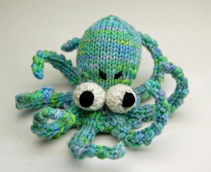 The body is worked in one piece in the round, the eyeballs are either knit on picked up stitches or knit separately & sewn on, & the tentacles are worked I-cord style.