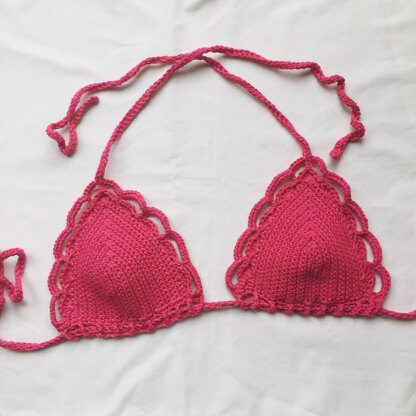 This bikini top puts a twist on the traditional string bikini, making it perfect for relaxing by the pool or chilling at the beach. Like a traditional string bikini this top has cups that move, meaning you can get the fit and coverage you desire. A combination of shell stitches and chaining creates the scalloped edging. This pattern is written for cup sizes: Small, Medium and Large with a totally customisable back tie. However information is given on how to adjust the cups sizes for the perfect fit.