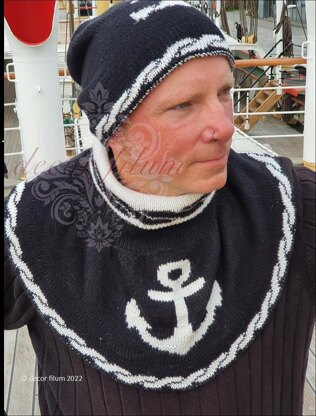 Pretty reversible doubleknit cowl with anchor and rope motives that offers lots of varieties and won’t only keep you warm and cosy when sailing or taking a walk on the beach.