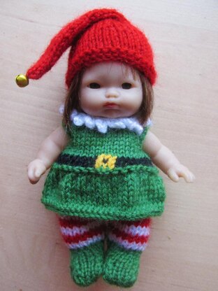 Little Elf set for your 5" Berenguer doll, knitted on 2.25mm straight needles and 4 ply yarn. It is very easy to make and uses red/white/green yarn, 2 x 3mm buttons, shirring elastic and a tiny bell. Instructions are for leggings, dress and hat.