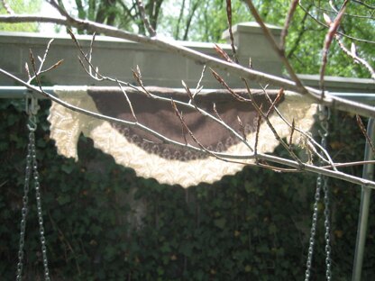 This shawl is knit from the top down and is crescent shaped. It has left and right lace borders adding interest to the stockinette portion of the shawl. The side border pattern is then worked along the bottom of the shawl. Changing colors for the final border shows off the wonderful leaf pattern.