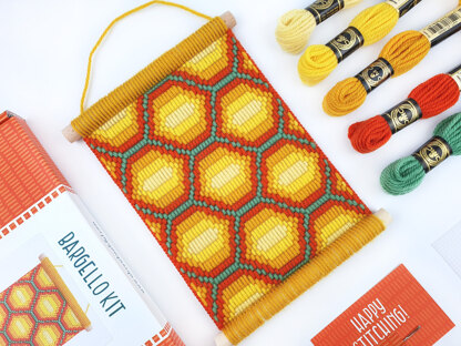This Bargello kit includes everything needed to make this funky, honeycomb wall hanging. Each Bargello Kit comes beautifully packaged in a project box and includes the best quality tapestry supplies: