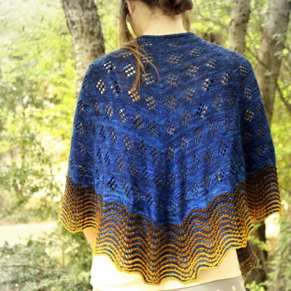 Old Magic is a large shawl that has a lovely drape and just the perfect amount of volume. The allover lace pattern is beautiful to behold (but simple to work) and the possibilities for the undulating waves of color at the edge are nearly endless!