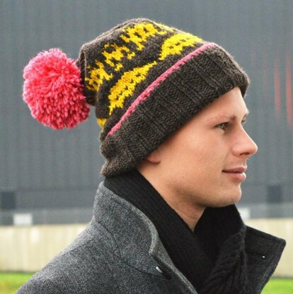This pattern involves following a color chart and working in stranded knitting. An alternative technique for creating the design is to duplicate stitch this design onto the hat after knitting. Stitches used include knit, purl, k2tog, and the M1 increase. This pattern is suitable for the intermediate to advanced knitter.