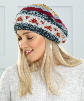 OLIVE can be knitted plain or patterned! Knitted using two strands of yarn held together, you can either choose to knit simple stripes with a little touch of fair isle. Or you can go for a much simpler beret and just use the two same coloured yarns held together throughout. Our plain beret combines black and grey – but you could use two strands of the same colour. And our patterned beret combines sections using the same colour doubled and two strands of two different colours.