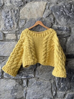 A super chunky cabled sweater, knitted all-in-one piece. First the lower body is knitted in the round, then divided for front and back with the side stitches put on hold, the neck is shaped with short rows. Then the sleeves are picked up from the shoulders and knitted downwards, picking up and decreasing the lower side stitches to join to the body, then knitting in the round to finish.