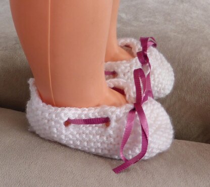 These baby shoes are knitted in garter stitch and have a threaded ribbon or i-cord bow at the toes.