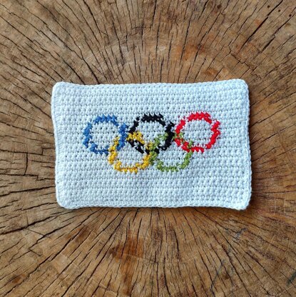 Easy crochet pattern of olympic flag, with charts. PDF pattern with clear instructions to make this flag and use as mug rug, applique on bag/rucksack or to make a bunting. You can make it if you know single crochet stitch, crocheting in rows and changing colors - Fair Isle technique. You will need about 20g of white yarn (sport weight cotton) and scraps of yellow, red, blue, green and black.