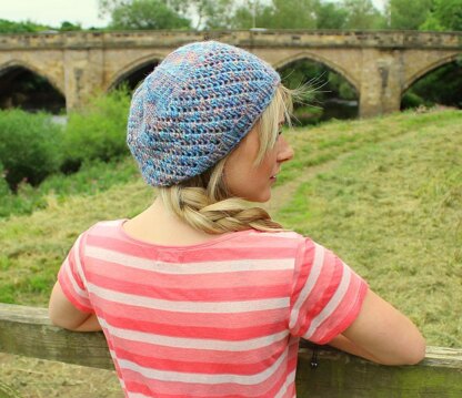 A slouchy beanie hat worked in the round. The brim is worked in a 2 x 1 rib. It has a spiralling mesh pattern followed by a few rows of stocking stitch The crown ends in the stocking stitch pattern using a simple decreasing rotation.