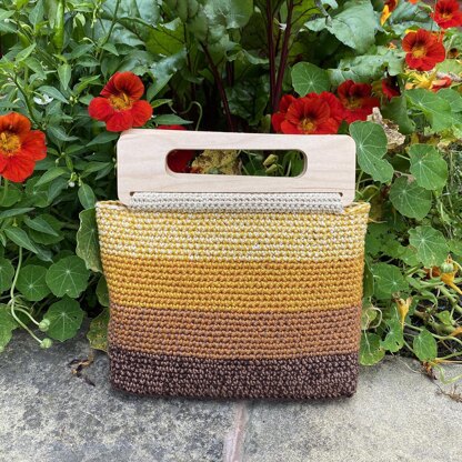 The bottom is worked in rows then stitches are picked up around the base to work the body in the round. The pattern uses two strands of yarn throughout with varying combinations to give the ombre effect. As well as a pair of wooden handles, a thin crocheted handle can be used to keep the bag on the shoulder.