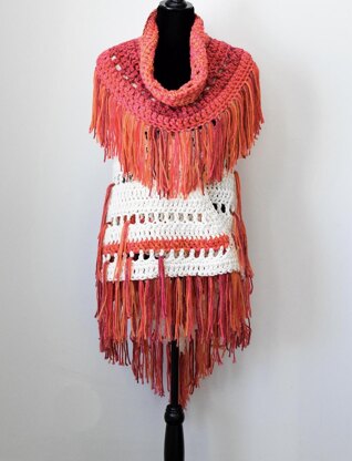 Measurements, From neck front to bottom is 32 inches not including the fringe. Back Length including fringe is 45 inches. The Detachable Matching Cowl measures 18 inches long with fringe, and 42 inch circumference at widest (bottom) part.