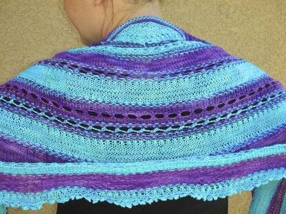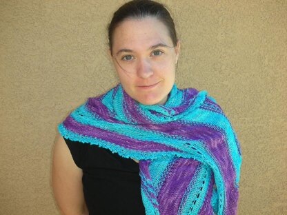 Yarn: Mary Gavan Yarns, Desert (50% Organic Cotton/50% Bamboo, 475 yards/434 m) 1 skein Turquoise (MC) and 1 skein Violets (CC) Needles: US 6/4 mm, 32-inch circular, or size needed to obtain gauge Gauge: 5 stitches per inch in stockinette stitch, blocked Finished Measurements: Approximately 70” wingspan, and 22 inches deep after blocking. Tools: Tapestry needle, scissors, stitch markers (if desired), blocking mats and blocking wires for pinning lace portion.