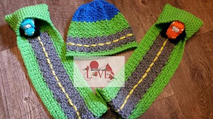 Instructions include: Scarf with pockets, how to make it to fit your child. Hat And even a little Car (you could always use toy cars, but I thought it would be easier to replace a crochet car)