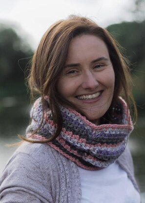 Crochet with a self striping bulky yarn is a simple way to make a fabulous multicolored item with only one skein. The One Pot Cowl is loose fitting with plenty of height which is gathered at the front, making it easy to wear.