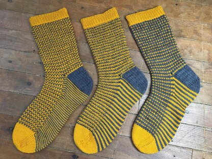 One stitch pattern. Two colors of yarn. Three different looks. The four-row pattern is simple to knit (only one color is used at a time) and by playing with color placement you can create three different socks that are the same, but different. Perfect for creating coordinating pairs of socks without being completely matchy-matchy!