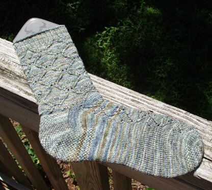 This is a lace sock that is knit from the toe up, with a slip stitch heel. There are 2 sizes, a 72 stitch leg and a 64 stitch leg. There is an option for doing the toe in an eye of partridge stitch.