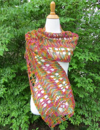 Open Mic Night I is a rectangular scarf featuring a windowpane repeating pattern, feather and fan edges and center, and a finish with an art-deco appearance. It is worked in one piece. The pattern pdf includes 4 photos as well as recipe ideas for changing the scarf dimensions.