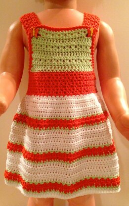 A pretty jumper with a touch of "overalls" style. Bold, textured stripes and a colorful bib make this a bright standout. Straps cross in back and button in front. Waistband buttons on left side. Works up quickly in worsted yarn but directions are easily adjusted for different yarns and sizes.