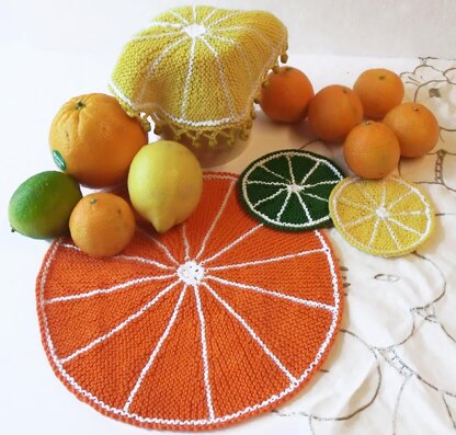 Fruit styled coasters, table mats and jug cover for a summer party or Bar B Q, Knit these in lots of different colours to make a stunning table setting.