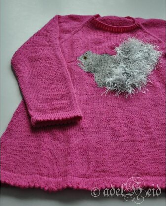 The tunic is knitted from top down and mostly in the round, but during the picture, which is worked in intarsia, the work is knitted back and forth. The furry tail on the picture is duplicated afterwards.