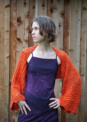 Orixa is a graceful statement piece designed to add warmth on those chilly spring and summer evenings. Knit it in a bright jewel tone and it’s the perfect complement to jeans and a cute tank; in an elegant neutral it’s alluring with eveningwear. You can wear it as a tubular scarf as well. Choose a luxury yarn like Hazel Knits Divine (Merino/Cashmere/Silk; shown) for beautiful drape.