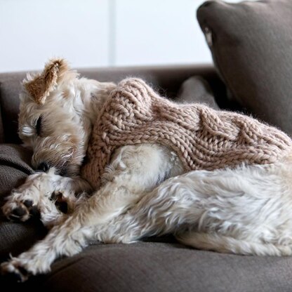 A classic cable dog sweater. This is an easy pattern that will knit up quickly and is easily adapted to suit most dog sizes.