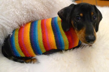When I got my little dachshund Otto I did not realise he would feel the cold. Even on a fairly mild morning he would be shivering away and thinking he would need to be carried rather than getting his delicate little toes anywhere near the ground. The solution - a lovely warm knitted coat. When I looked at the available patterns they all seemed to involve posting tiny little legs into little sleeve like holes which I knew would be a nightmare with such a wriggler so I designed this simple coat with a nice wide strap for under the tummy and straps to do up around the chest. Much easier than posting tiny wriggly paws into sleeve like holes. Otto Has tried his jacket on even though it is Summer and he seems to be quite happy with it. I have made it very bright and stripy but you could knit it plain or in your football team colours. It is a very adaptable pattern. The coat is lined with fleece fabric and has velcro fastenings for ease of getting off and on.