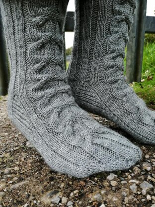 The pattern features a distinctive cable and ribbing which makes them stretchy and ensures a snug fit. The simple to work 4x4 cable is made interesting and unusual by adding elongated stitches and strategically placed purl stitches. The socks are worked from the toe up with a ribbed gusset, reinforced short row heels, and heel flap. The cable pattern is charted and written. Directions for four sizes are given. The pattern is needle-neutral, use your preferred type of needles.