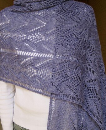 The shawl is made up of a single lace stitch that is only charted. The focal lace stitch is a variation of different leaf lace patterns, and comes to us from Russia. The final size is 22 1/2 inches by 72 inches.