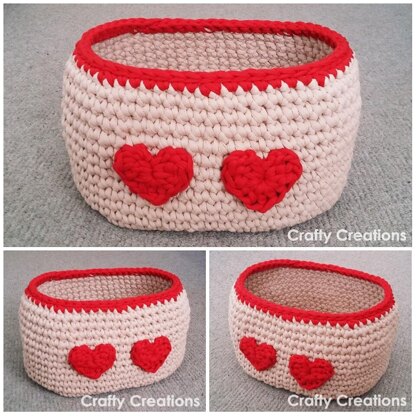 This oval crochet basket is made with T-shirt yarn, and works up very quickly and easily.