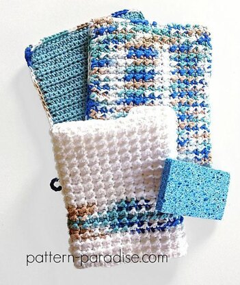 This is a pretty and functional kitchen set. The oven mitt/potholder is uniquely designed with a double thickness and textured palm to allow for comfort in handling hot pots. The dishtowel is generously sized to handle even the largest jobs. The textured stitch combination combined with the cotton fibers makes these dishtowels super absorbent. Quick to stitch and easy to adjust size if desired.
