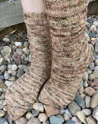 Texture and slipped stitches form triangles pointing up on one sock and pointing down on the other. The shapes are formed with lace, but the yarnovers are worked through the back loop to close them. Or leaving them open for a lacy, more feminine look.