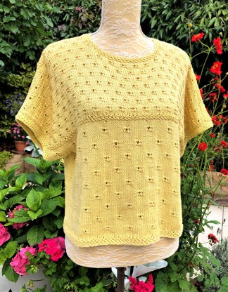 This top is so pretty and the wide fit in this soft yarn adds drape. If you like cropped, boxy and easy to knit, you'll love this design, but also easy to increase the length as indicated in the instructions. Just remember this may require more yarn than stated. The main pattern consists of individual eyelets highighted with purl stitch "ridges" on the previous and following rows, adding texture. On the yoke the same pattern is used but with eyelets set closer together. All borders are worked in a pretty slip stitch pattern. Worked bottom up with full written instructions.