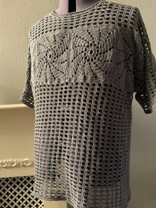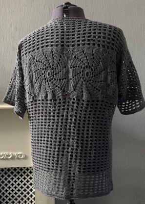 This crochet pattern is for an oversized men's round neck t-shirt, with spiral square motifs and an open mesh. The body shape is square and the sleeves are large and baggy. The T-shirt could be worn as is in hot weather or over another top to add a bit of colour. The design is made from the squares outwards, so up to the neck, down to the hem and out along the arms. There are only two seams across the shoulders. The pattern was designed using DK (8 ply) cotton, but this is thinner than acrylic or wool. It could be made in 4 ply cotton where thicknesses are similar. The instructions include lots of detail to ensure shaping is made easy. There is a photographic and chart guide for making the Squares There is a lot of stretch in the finished item, so the sizing is only approximate. I have listed this pattern as "intermediate" because of shaping and pattern techniques. Recommended Yarn DK cotton, Small 400g Large 500g XXL 600g
