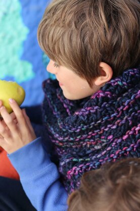 A quick knit in chunky or super bulky yarns, it also works beautifully with yarns that have lots of character. The pattern is simple and creates an interesting texture with oblique raised lines running at an angle in one colour, and subtle texture lines running across the current in the under colour. The result is a very warm, snuggly cowl which is narrow enough to be worn like a scarf, but without the risk of falling off and being left on a train somewhere.