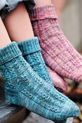 I decided to keep this one simple and somewhat boyish with easy cable columns interrupted by occasional rounds of garter stitch. A fold-over cuff is inspired by manly work socks and the pattern is sized to fit the whole family, It can be worked either top-down or toe-up for ultimate flexibility.